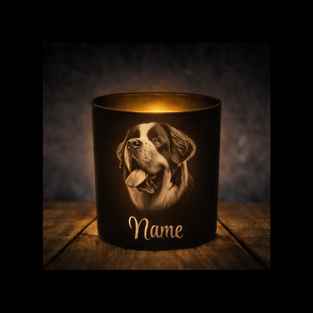 Dieses stilvolle, matt-schwarze Glas wird individuell mit einer hochwertigen Gravur Ihrer gewünschten Hunderasse sowie dem Namen Ihres treuen Vierbeiners veredelt. Ob mit einem Teelicht oder einer Lichterkette – die Gravur entfaltet bei Beleuchtung von innen eine wunderschöne, stimmungsvolle Wirkung.