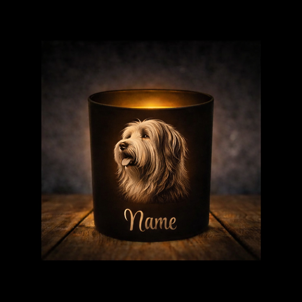 Dieses stilvolle, matt-schwarze Glas wird individuell mit einer hochwertigen Gravur Ihrer gewünschten Hunderasse sowie dem Namen Ihres treuen Vierbeiners veredelt. Ob mit einem Teelicht oder einer Lichterkette – die Gravur entfaltet bei Beleuchtung von innen eine wunderschöne, stimmungsvolle Wirkung.