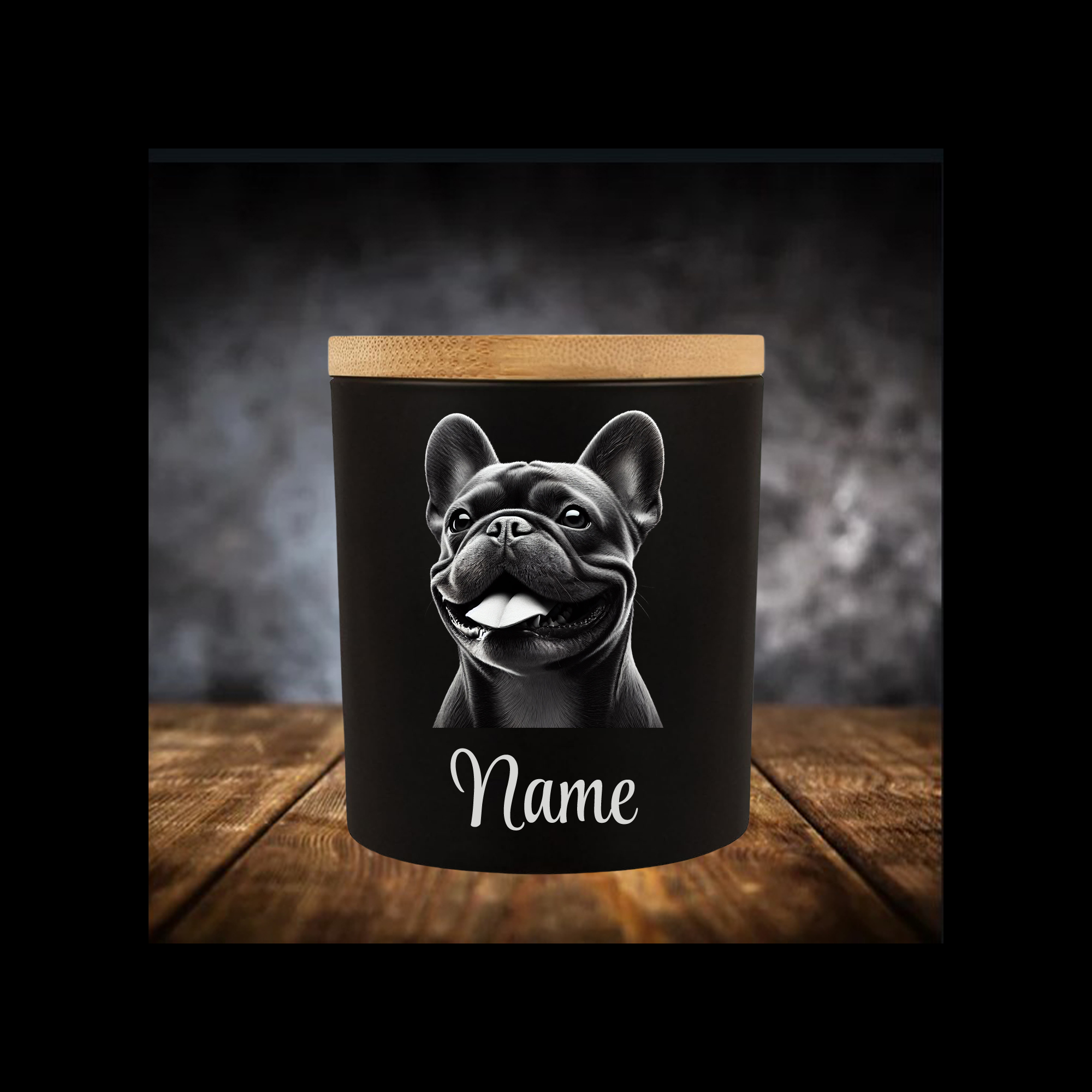 Französische Bulldogge Leckerliglas | Kerzenglas Matt Schwarz | Gravur Hund mit Name Personalisiert